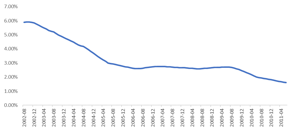 圖:2002-2011年經(jīng)濟(jì)適用房投資占地產(chǎn)投資比例