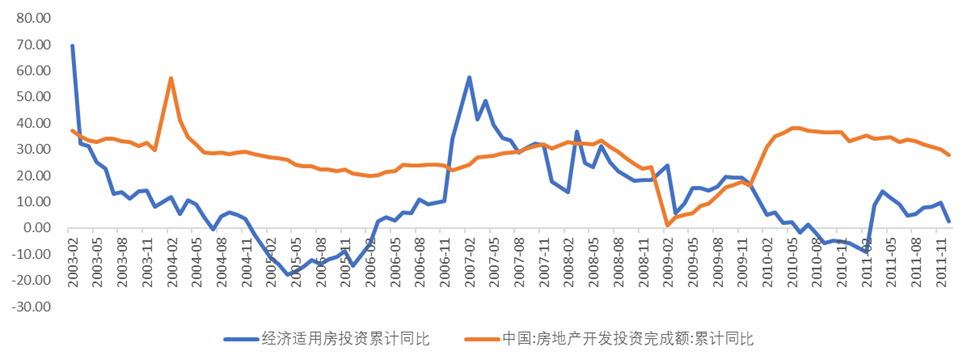 圖:經(jīng)濟(jì)適用房投資累計(jì)同比增速與地產(chǎn)投資增速對(duì)比