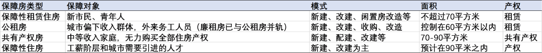 而未來(lái),保障性住房和保障性租賃住房,分別從實(shí)際產(chǎn)權(quán)房和租賃模式,與商品房一同構(gòu)成我們的多元化住房供給體系。14號(hào)文的推出,也確實(shí)重新構(gòu)建了我國(guó)的多元化、多層次保障住房體系,具體詳見(jiàn)下表。